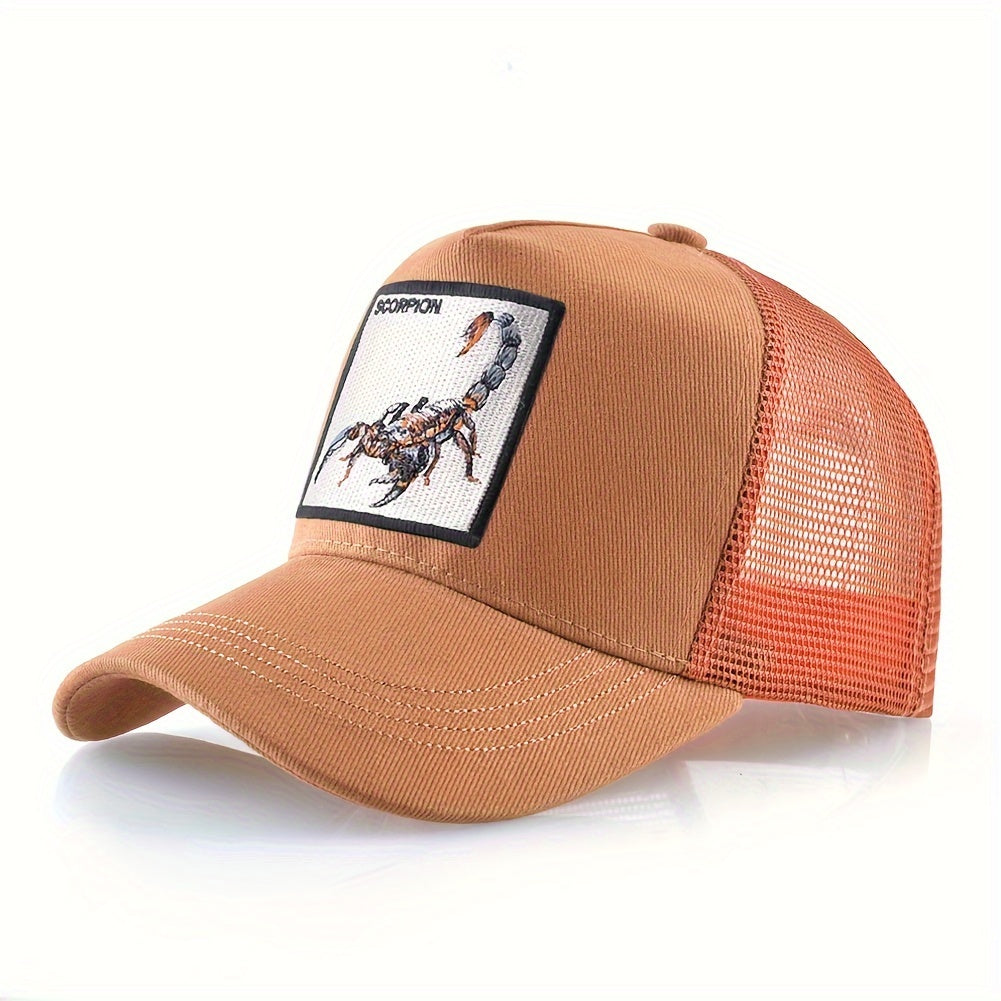 Unisex Embroidered Scorpion Baseball Cap - Breathable Mesh Trucker Hat for Outdoor Sports & Hip-Hop Style, Summer Casual Wear, Black & Beige Design with Bold "WARNING" Print