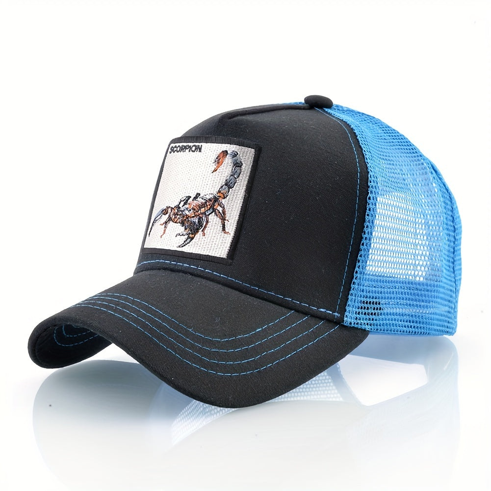 - Unisex Embroidered Scorpion Baseball Cap - Breathable Mesh Trucker Hat for Outdoor Sports & Hip-Hop Style, Summer Casual Wear, Black & Beige Design with Bold "WARNING" Print Unisex Embroidered Scorpion Baseball Cap - Breathable Mesh Trucker Hat for Outdoor Sports & Hip-Hop Style, Summer Casual Wear, Black & Beige Design with Bold "WARNING" Print